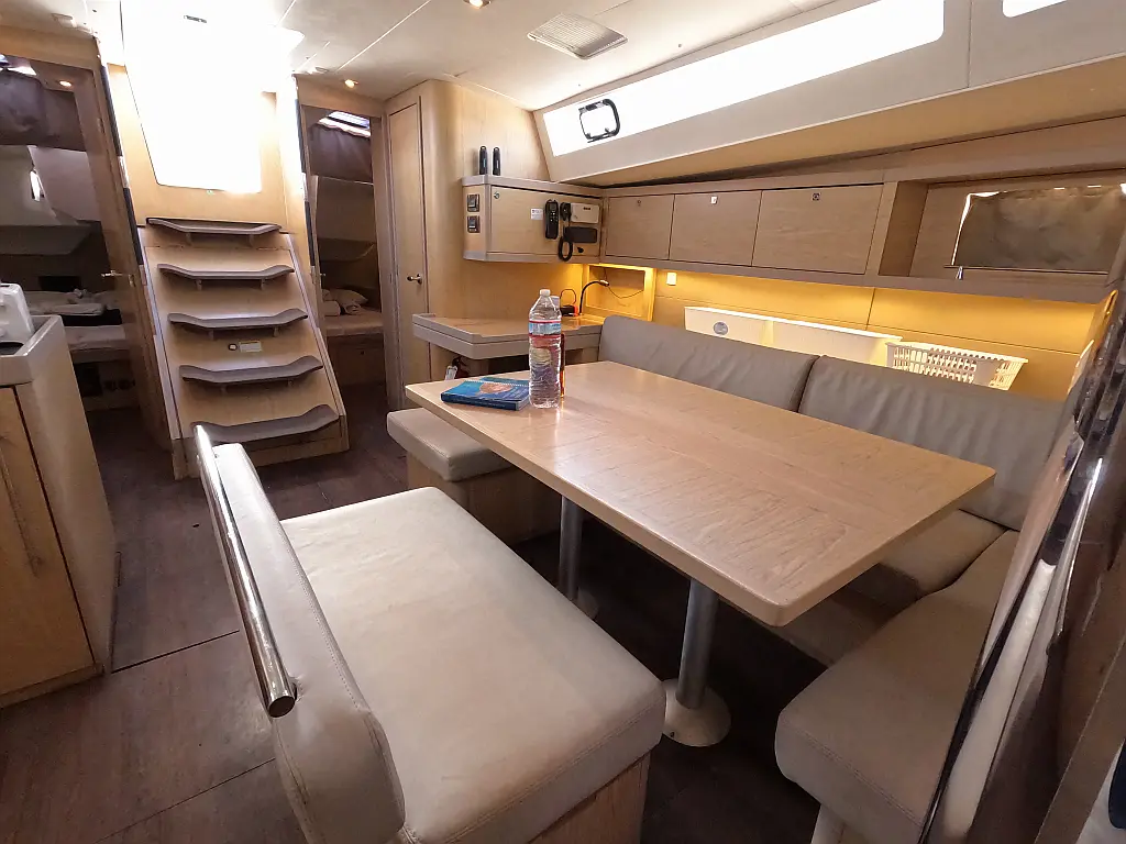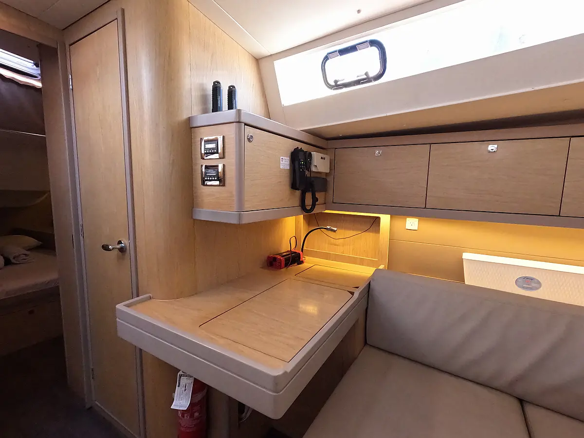 Cafetera, Nevera, Wi-Fi e Internet, Convertidor, Embarcación auxiliar, WC eléctrico, Aire acondicionado, Generador, Cockpit cushions, Panel Solar, Altavoces exteriores, Bímini