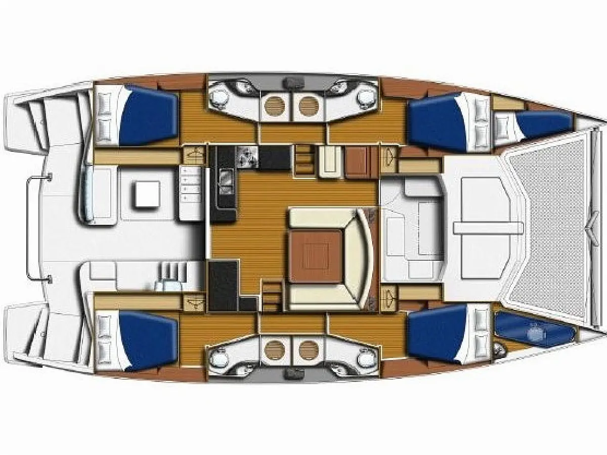 4 4 double cabins + 1 individual front peak cabin + convertible saloon
