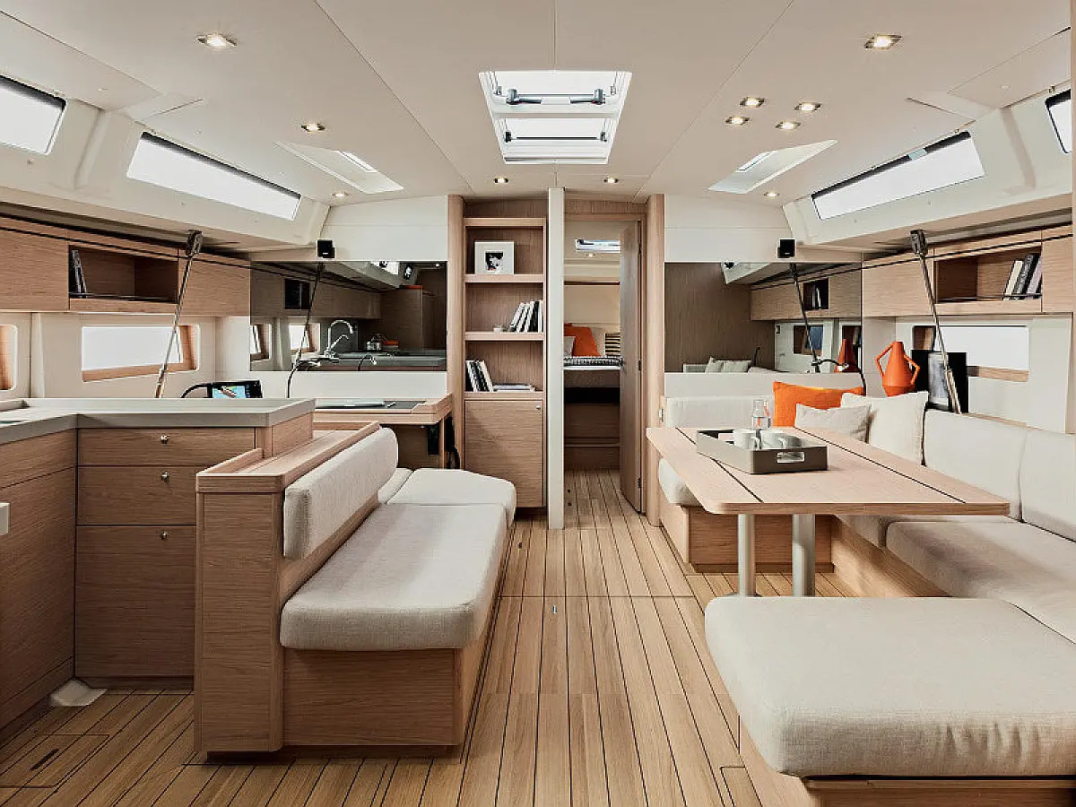 Aire acondicionado, Mesa convertible, Capota antirociones, Bímini, Embarcación auxiliar, Altavoces exteriores, Winches eléctricos, WC eléctrico, Panel Solar, Generador, Cockpit cushions, Teak Cockpit