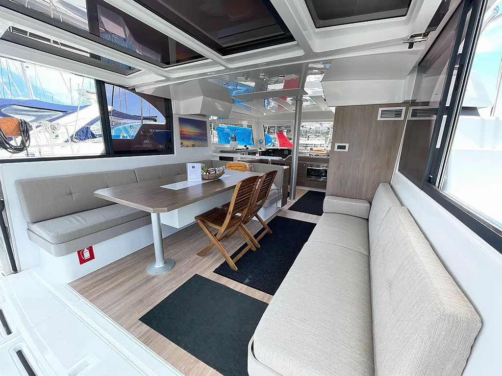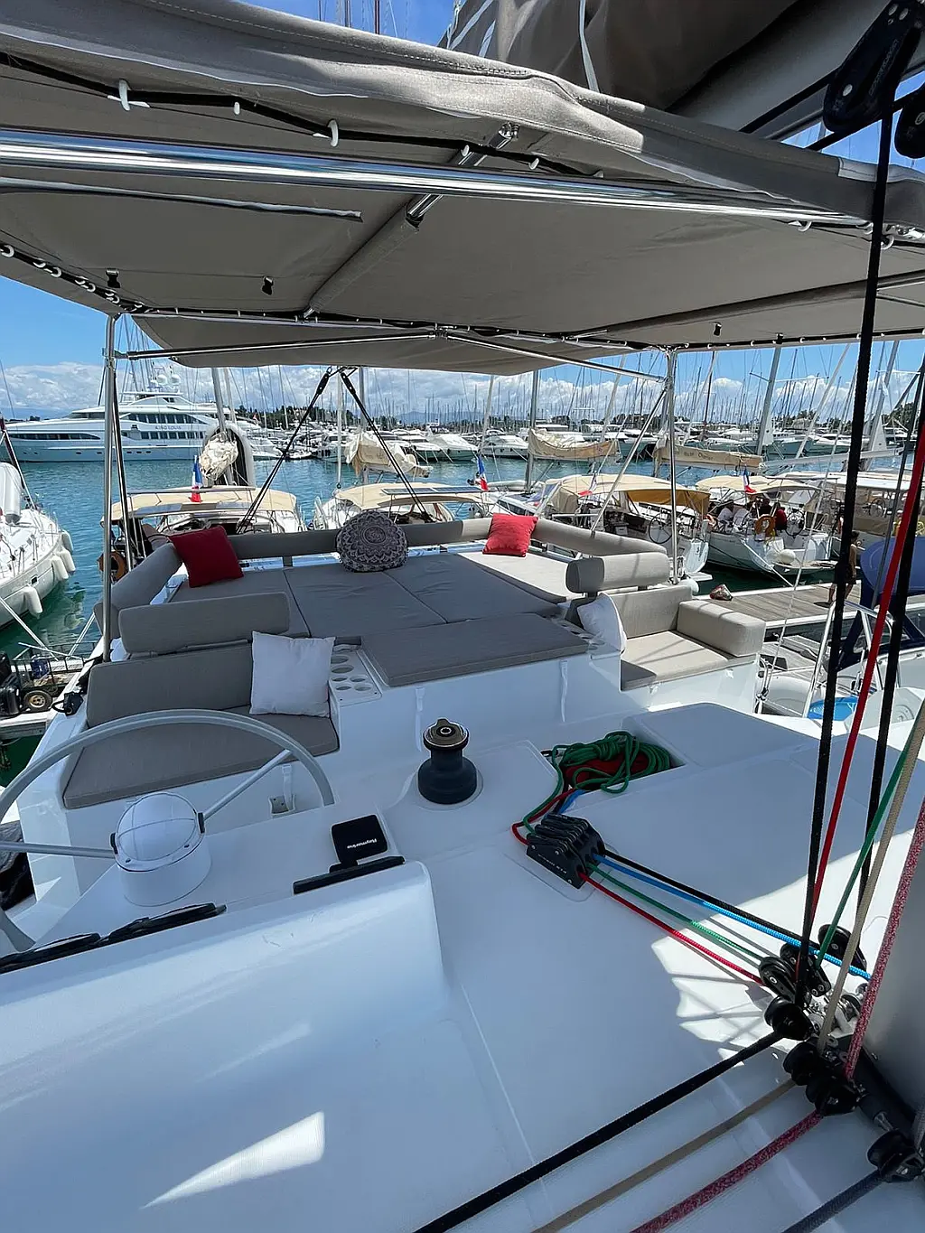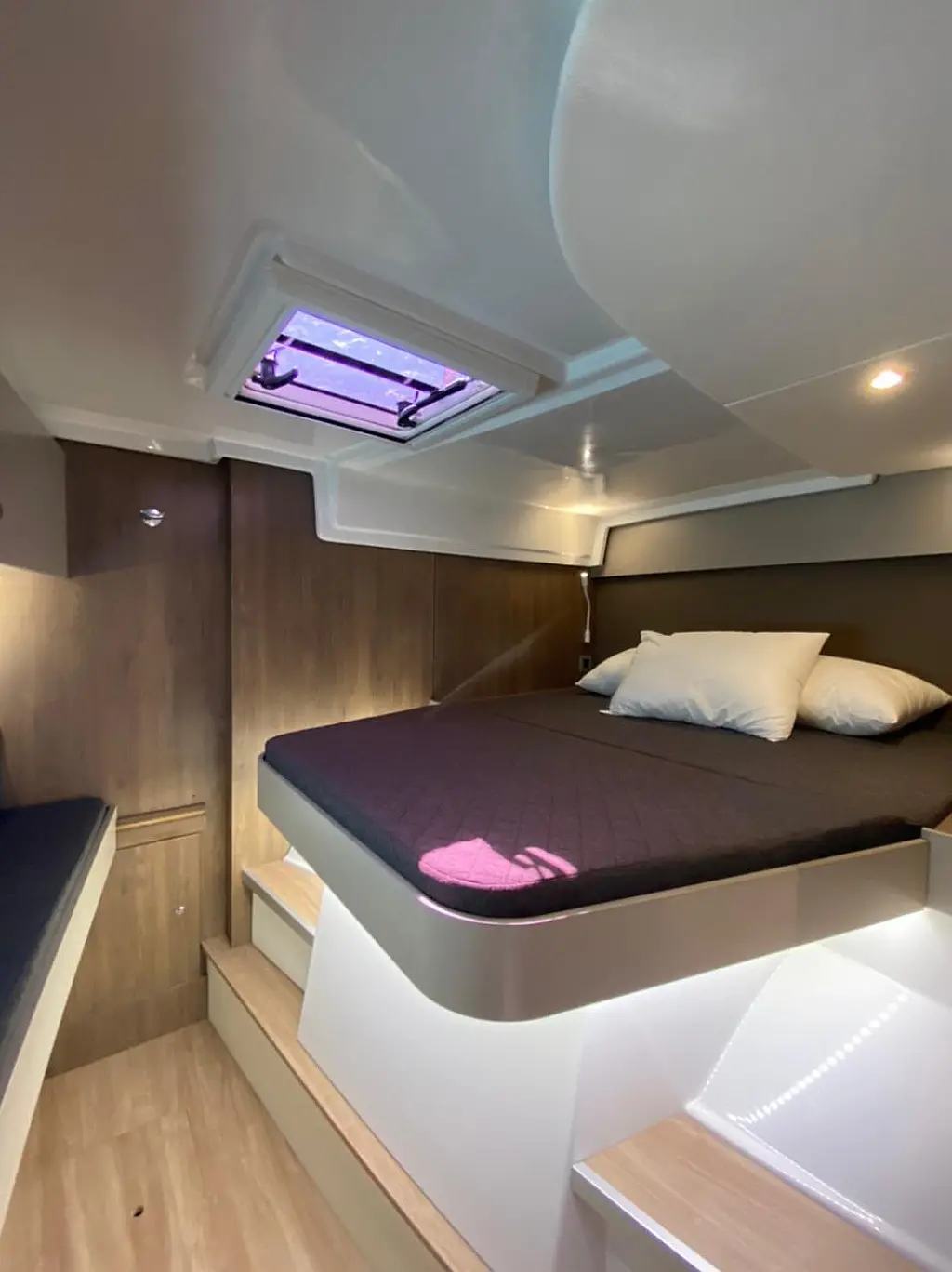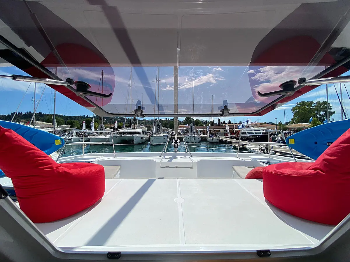 Bímini, Capota antirociones, Altavoces exteriores, Embarcación auxiliar, Máquina de hielo, Depósito de aguas residuales, Panel Solar, Cockpit cushions, Plataforma de baño, Flybridge, Cafetera, Nevera, Convertidor