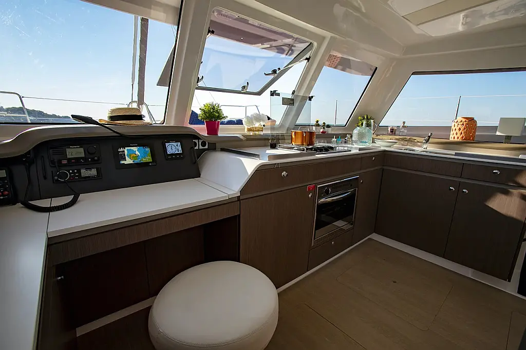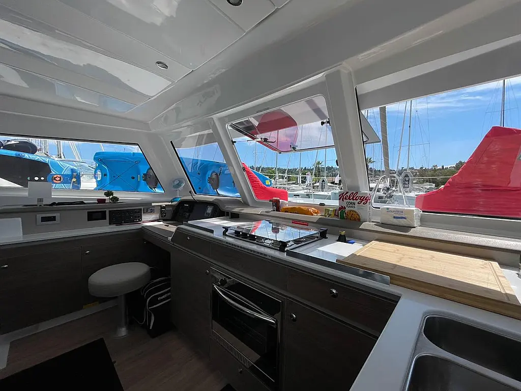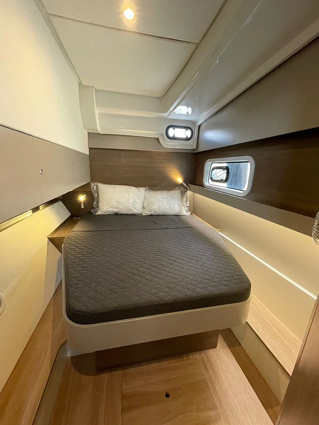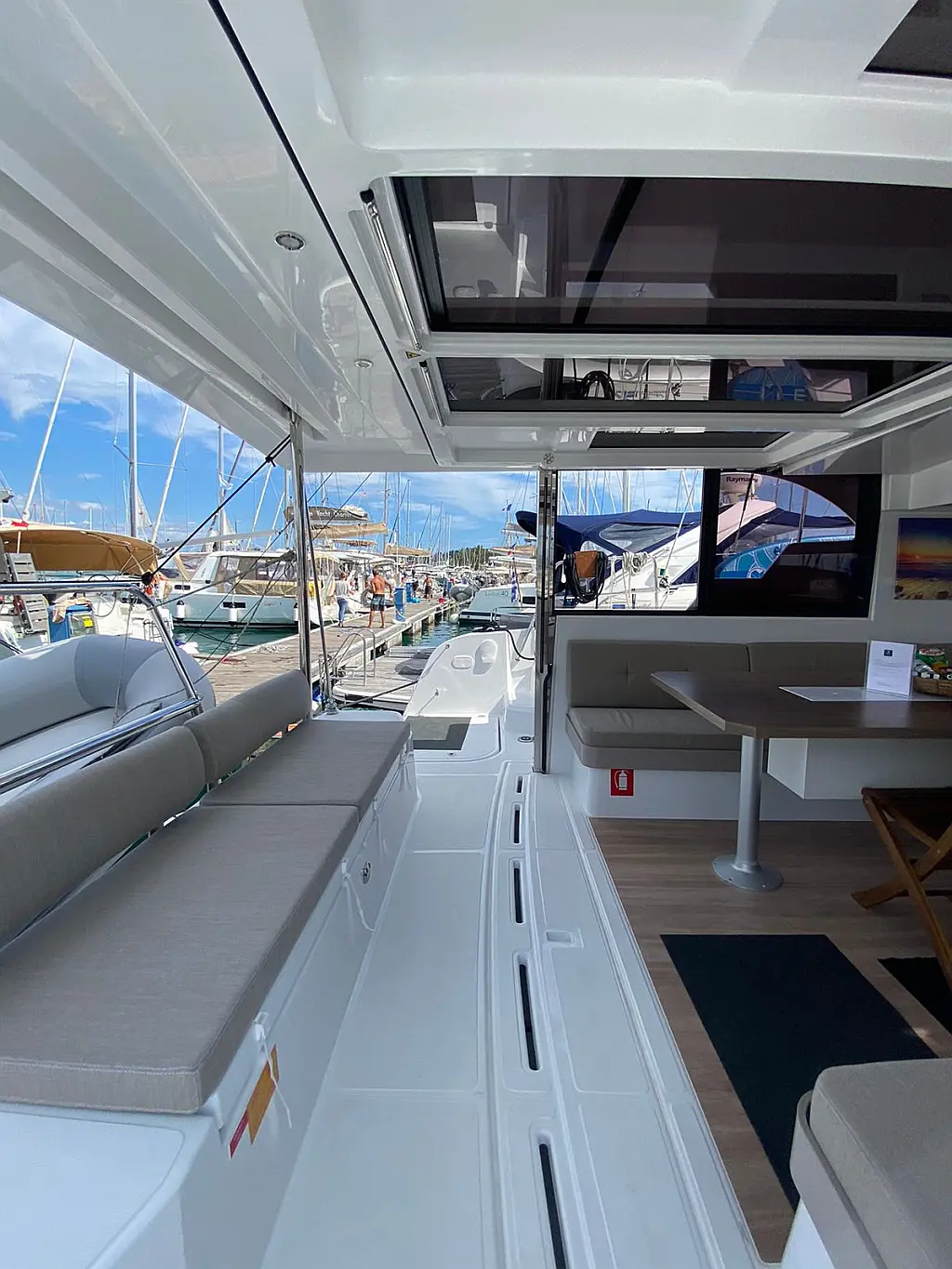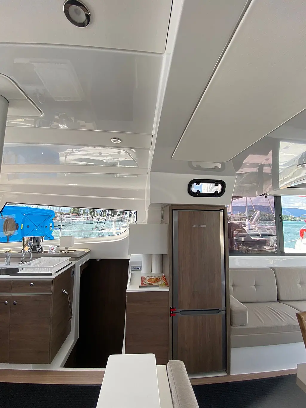 Bímini, Capota antirociones, Altavoces exteriores, Embarcación auxiliar, Máquina de hielo, Depósito de aguas residuales, Panel Solar, Cockpit cushions, Plataforma de baño, Flybridge, Cafetera, Nevera, Convertidor