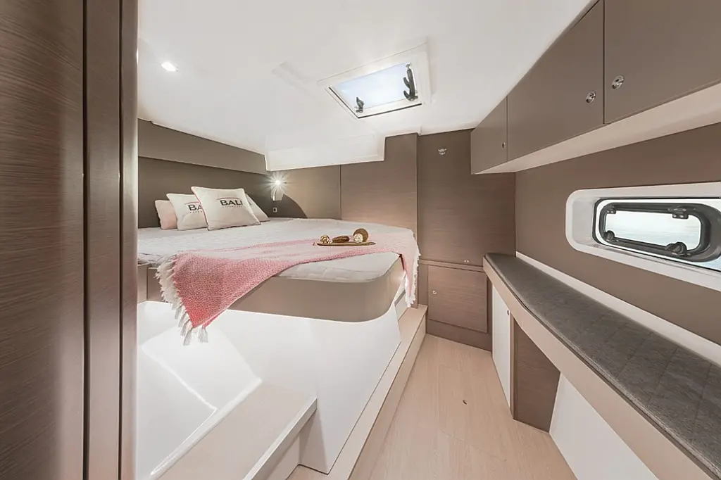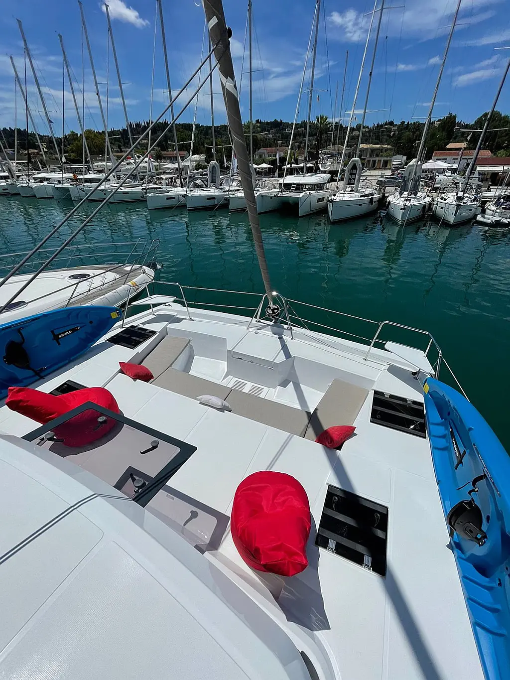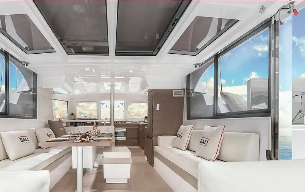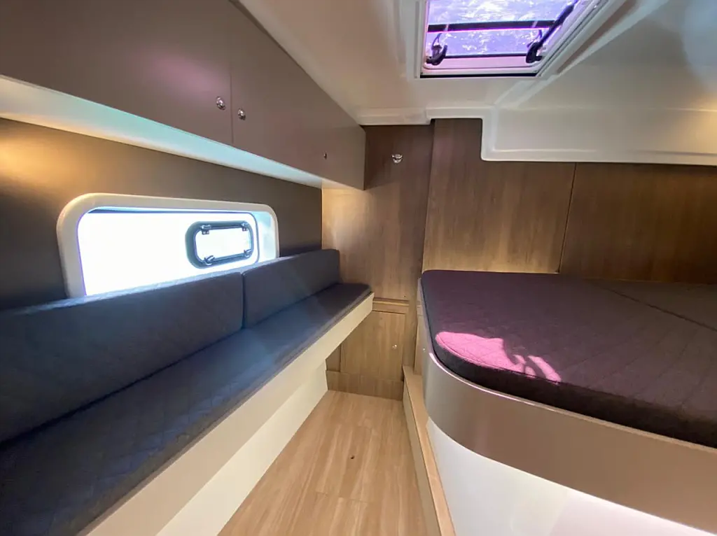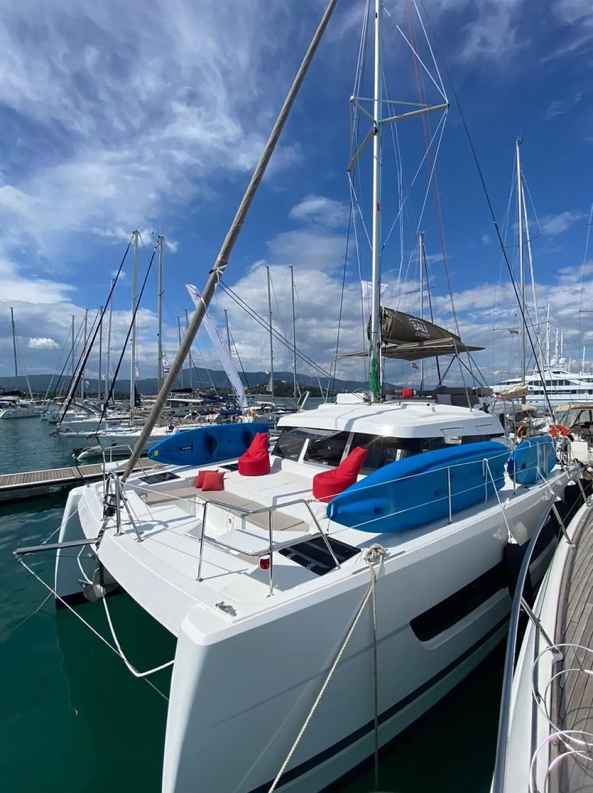 Bímini, Capota antirociones, Altavoces exteriores, Embarcación auxiliar, Máquina de hielo, Depósito de aguas residuales, Panel Solar, Cockpit cushions, Plataforma de baño, Flybridge, Cafetera, Nevera, Convertidor