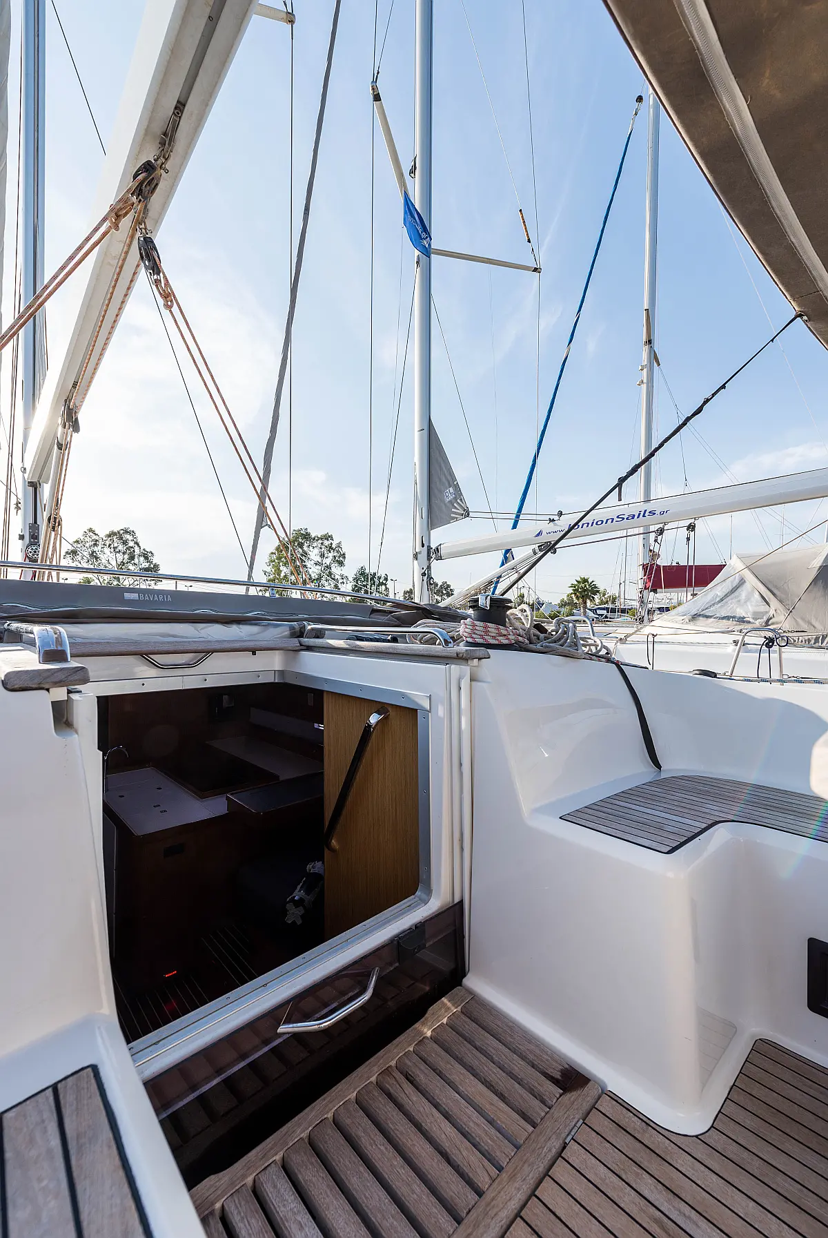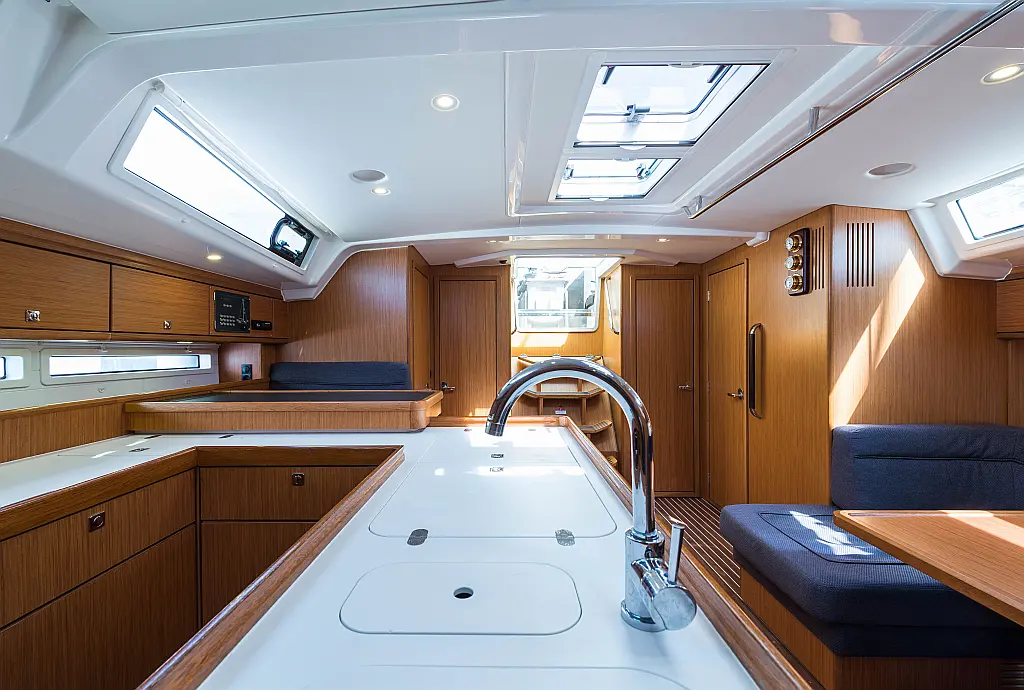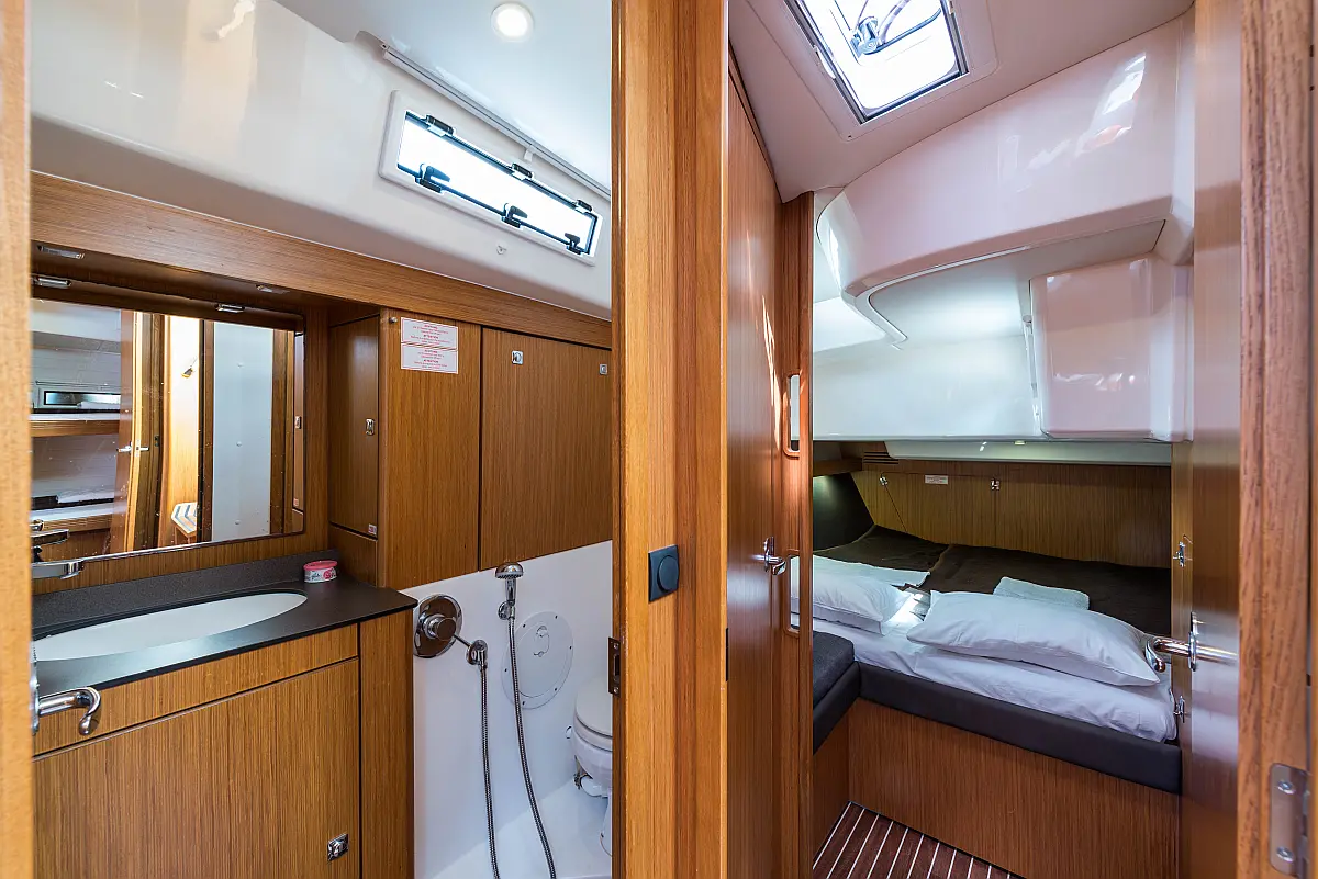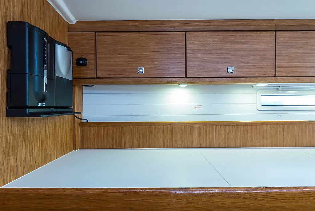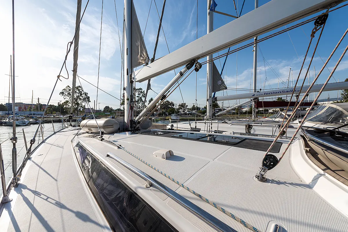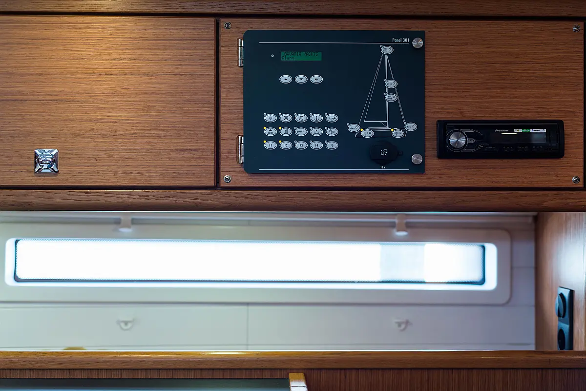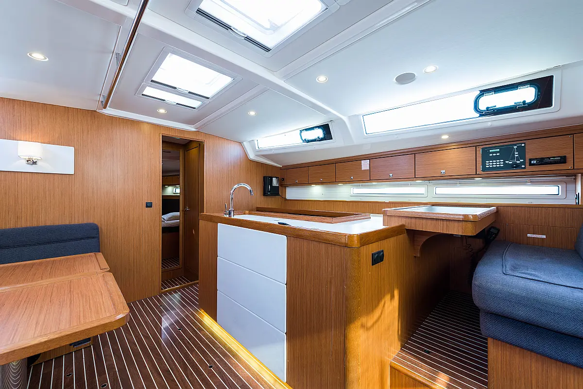 Aire acondicionado, Bímini, Capota antirociones, Embarcación auxiliar, Altavoces exteriores, Winches eléctricos, WC eléctrico, Panel Solar, Generador, Cockpit cushions, Teak Cockpit