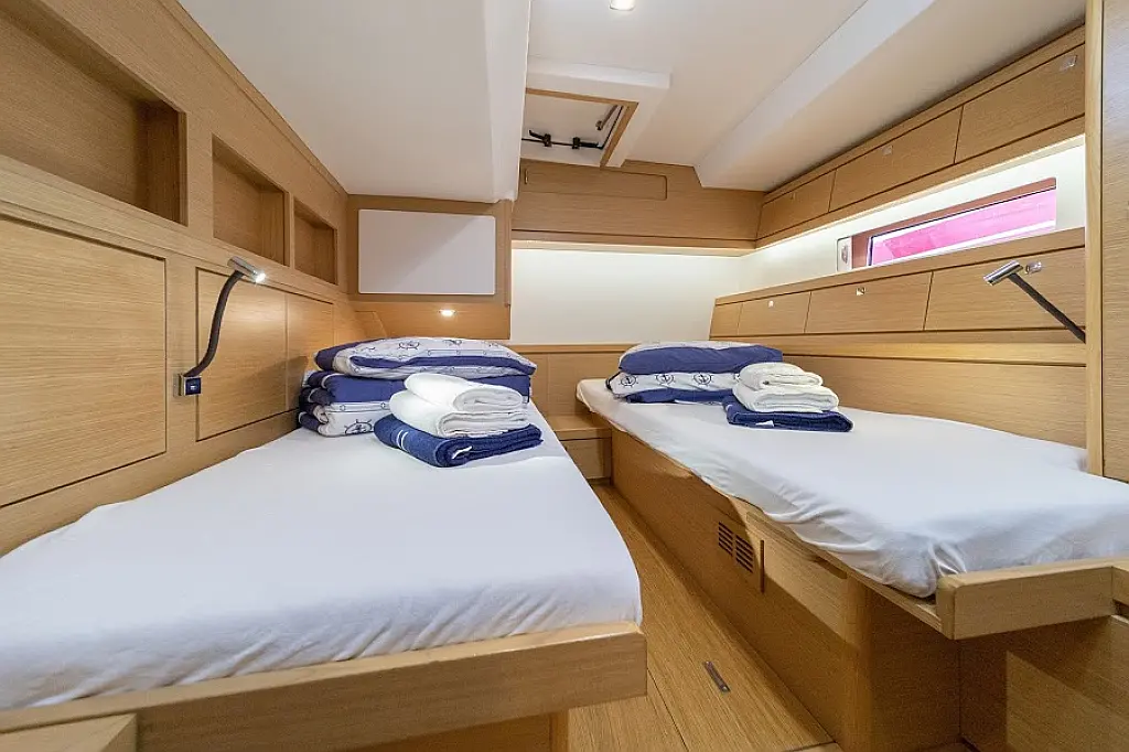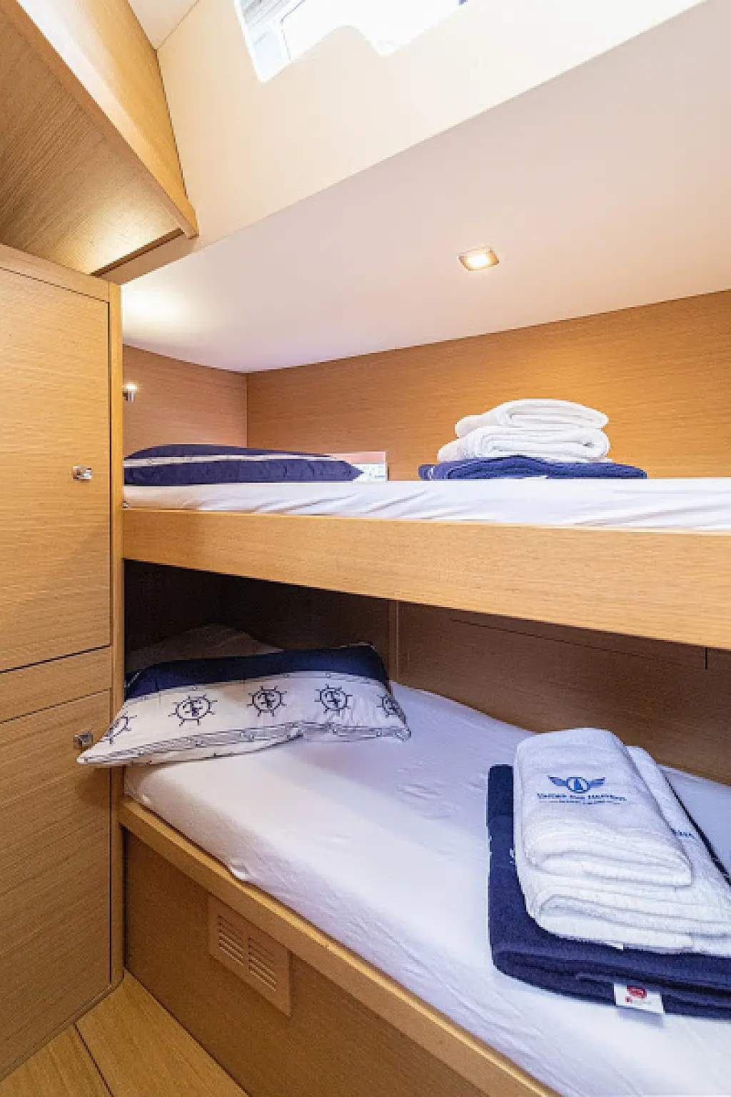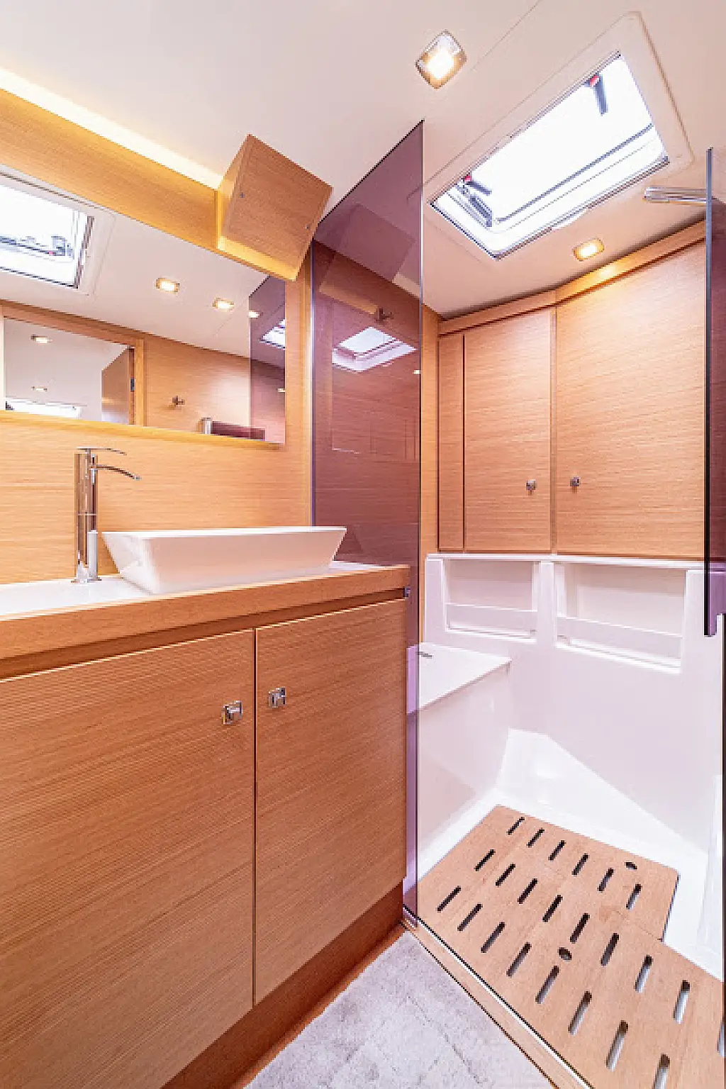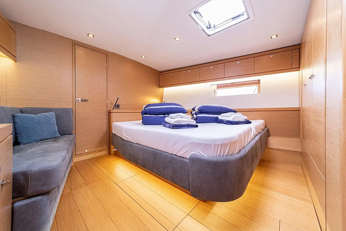 Nevera, Cafetera, Depósito de aguas residuales, Convertidor, Desalinizadora, Embarcación auxiliar, Aire acondicionado, Bímini, Cockpit cushions, Motor fueraborda, Parrilla en carlinga, Cubierta de teca, Generador, WC eléctrico, Pasarela hidráulica