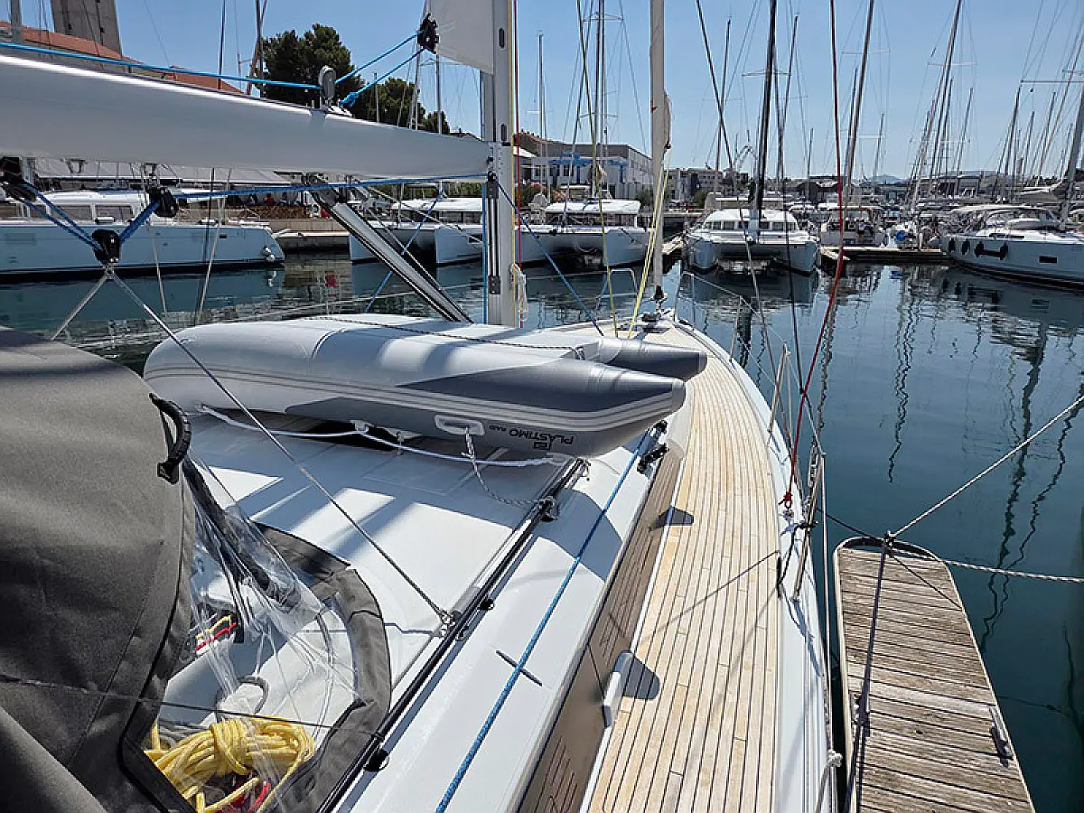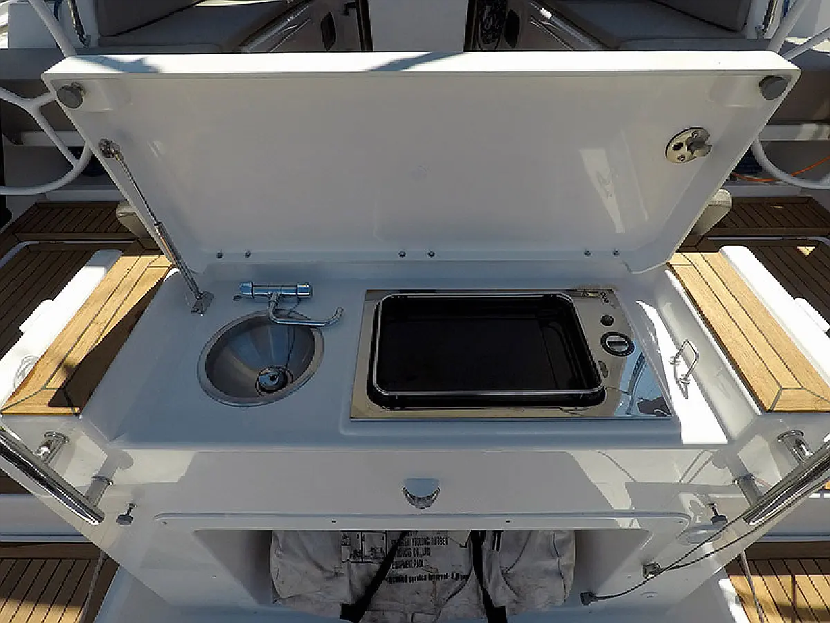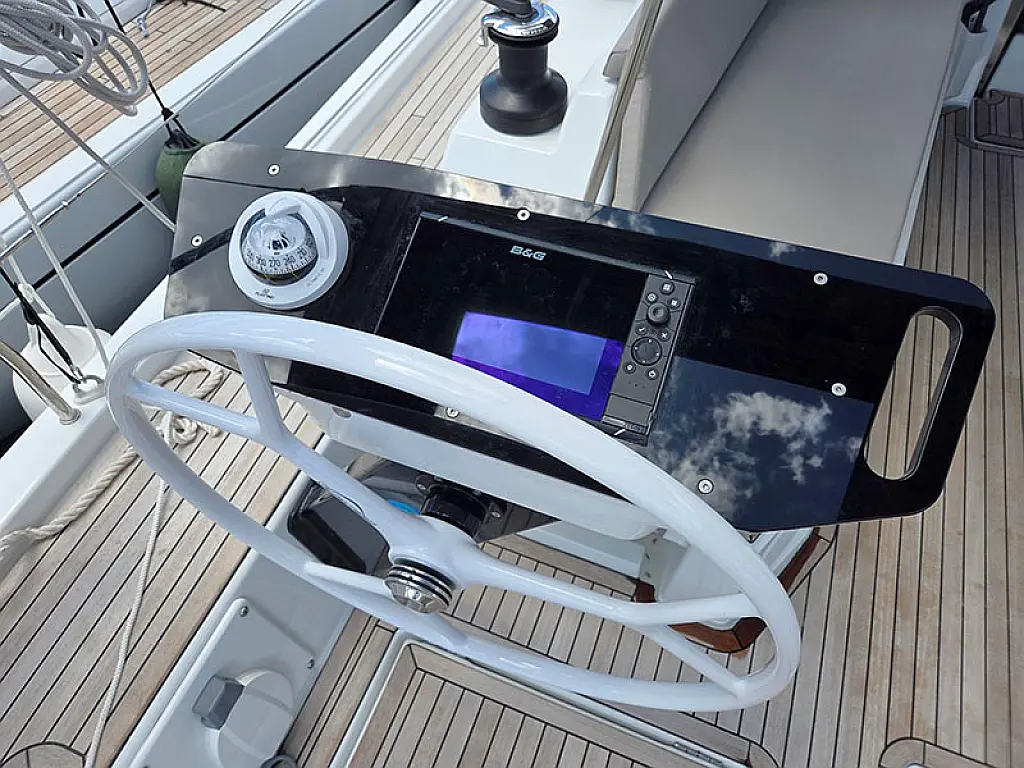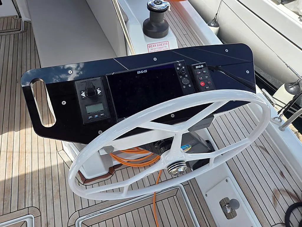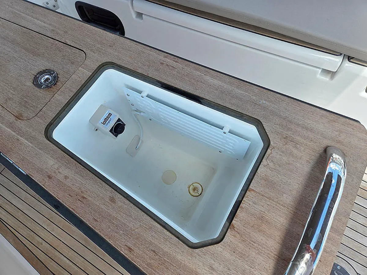 Generador, Aire acondicionado, Nevera, Parrilla en carlinga, Bímini, Cockpit cushions, Capota antirociones, Motor fueraborda, Cubierta de teca, Embarcación auxiliar, Winches eléctricos, Wi-Fi e Internet