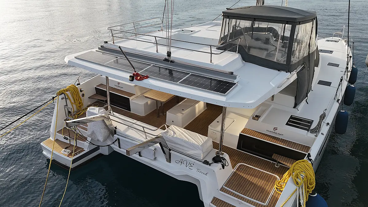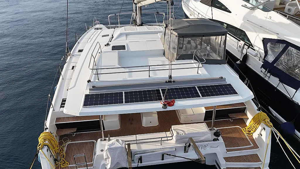 Panel Solar, Motor fueraborda, Nevera, Embarcación auxiliar, Convertidor, WC eléctrico, Calefacción, Winches eléctricos, Máquina de hielo, Capota antirociones, Bímini, Wi-Fi e Internet