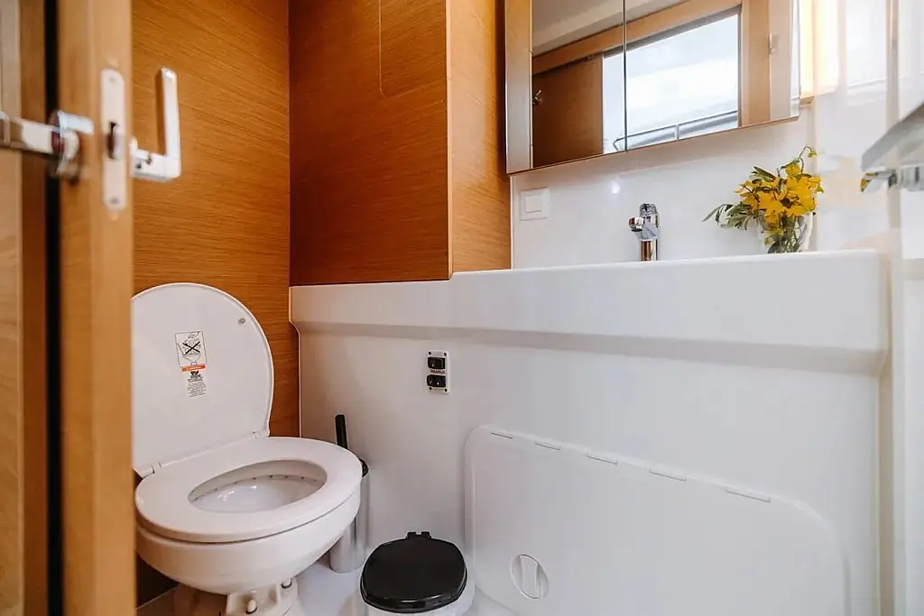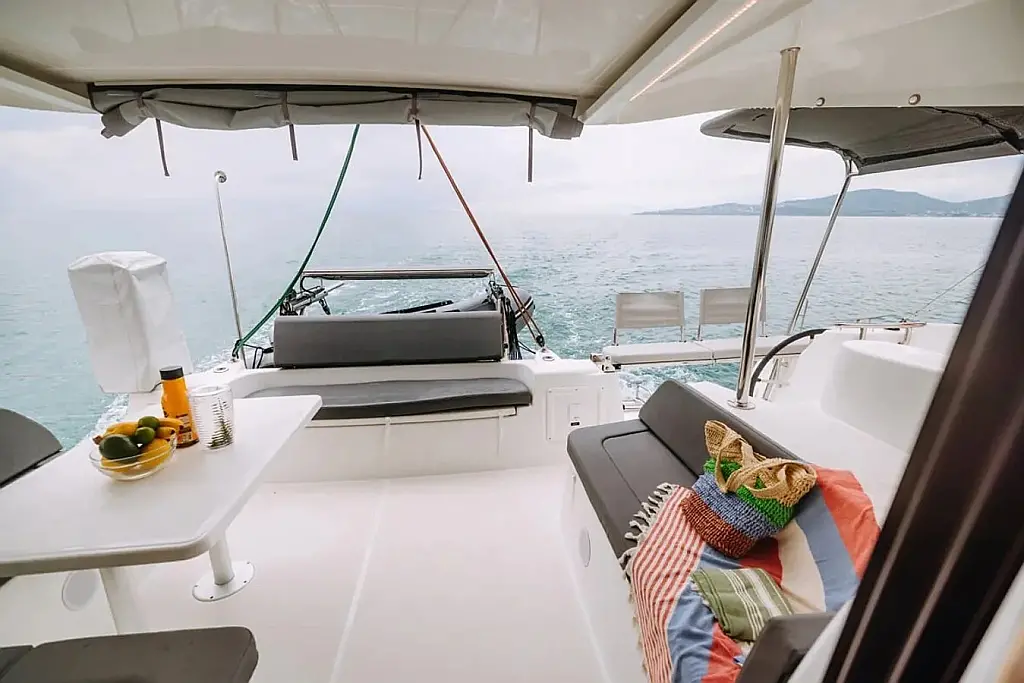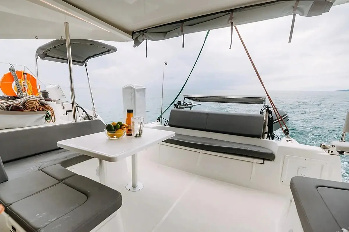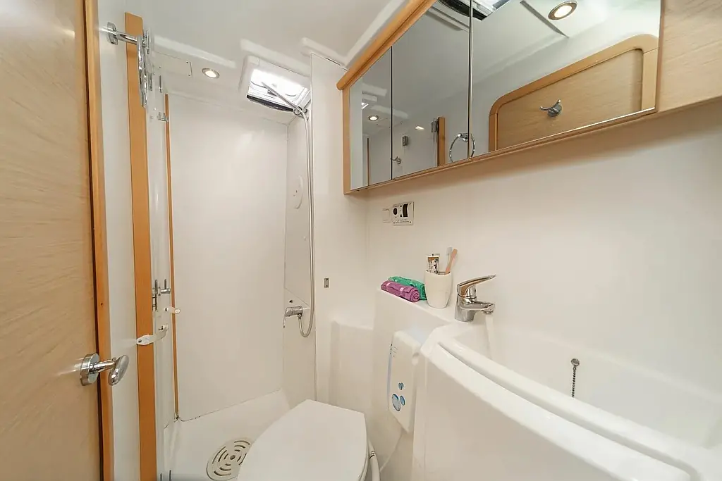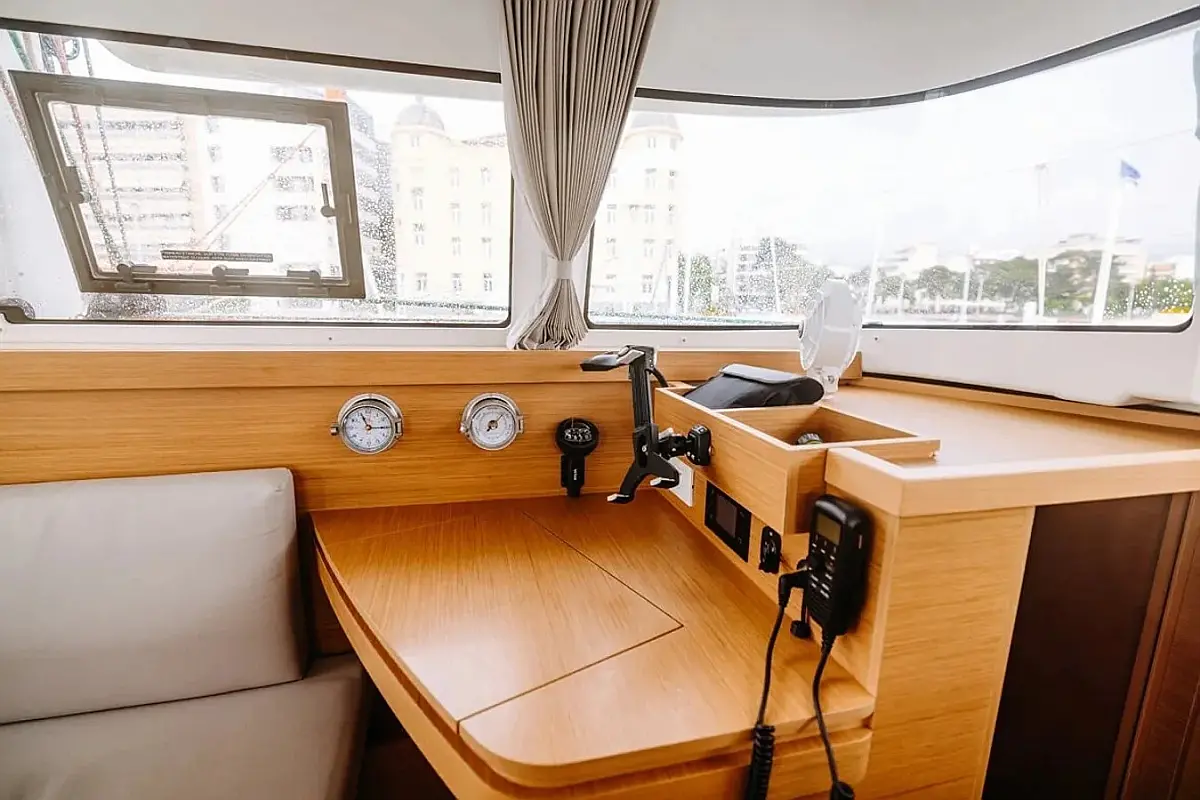 Bímini, Altavoces exteriores, Cafetera, Embarcación auxiliar, WC eléctrico, Máquina de hielo, Motor fueraborda, Nevera, Panel Solar, Capota antirociones, Cubierta de teca, Wi-Fi e Internet