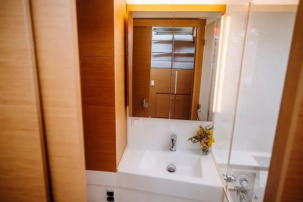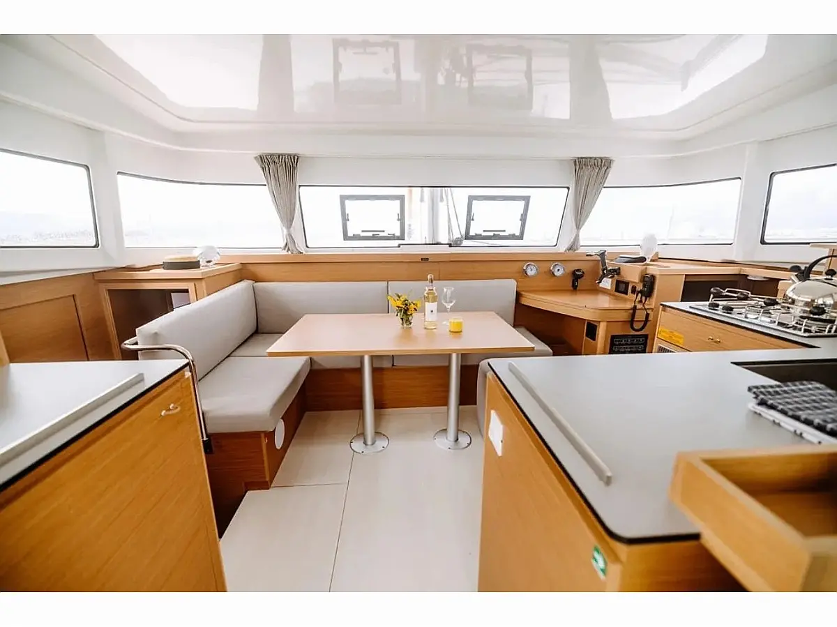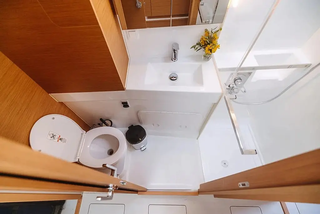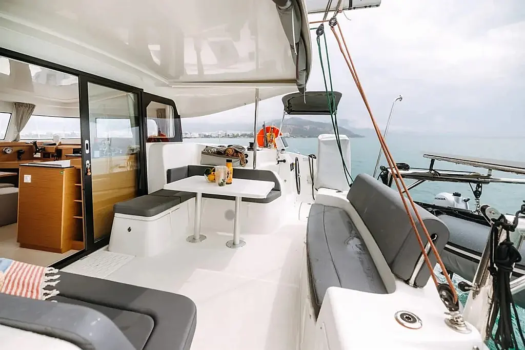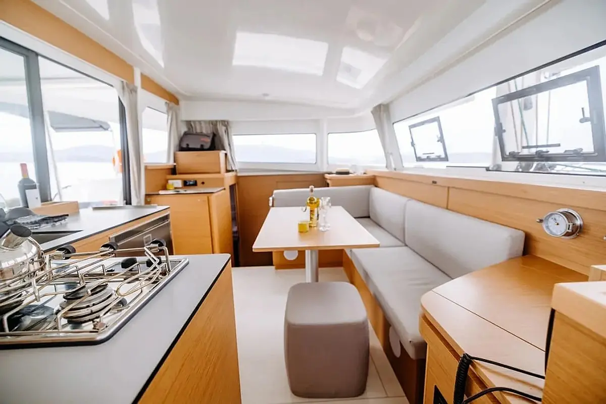 Bímini, Altavoces exteriores, Cafetera, Embarcación auxiliar, WC eléctrico, Máquina de hielo, Motor fueraborda, Nevera, Panel Solar, Capota antirociones, Cubierta de teca, Wi-Fi e Internet