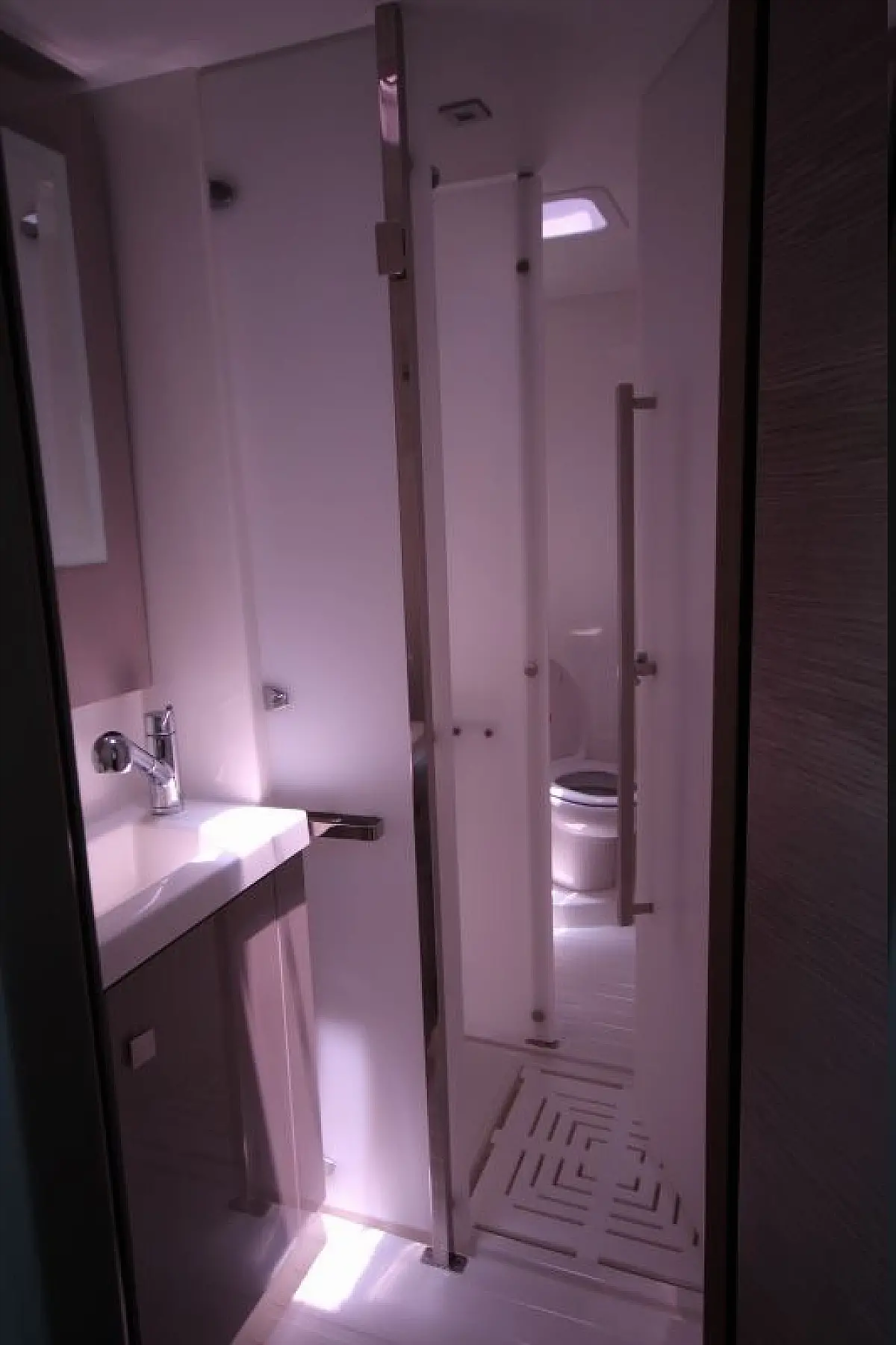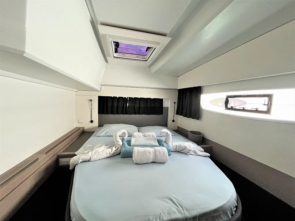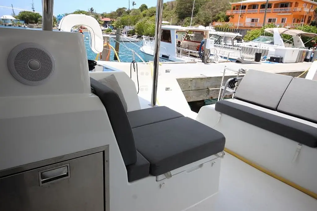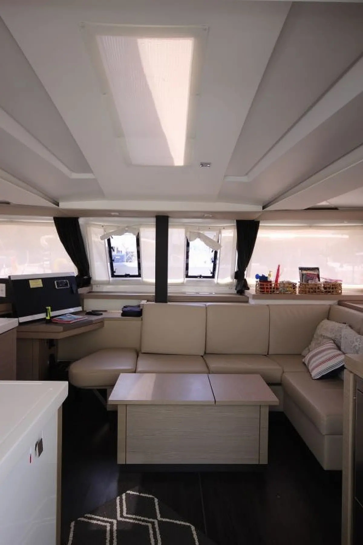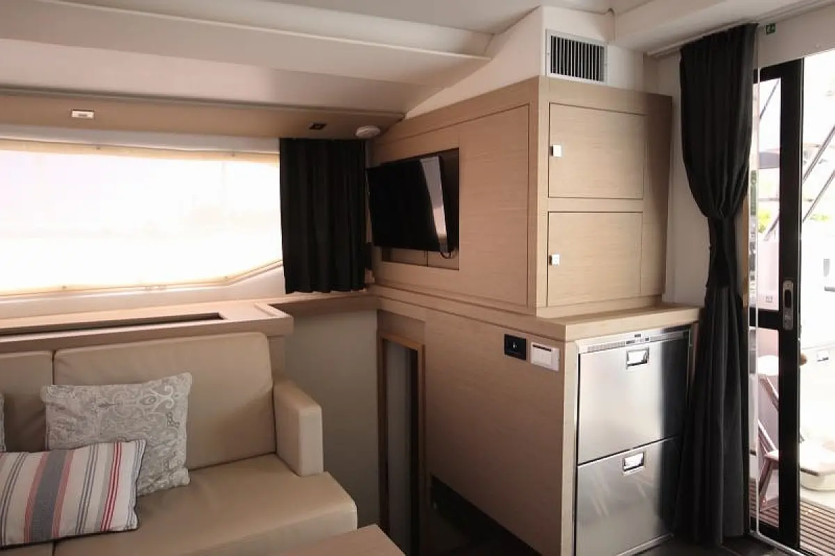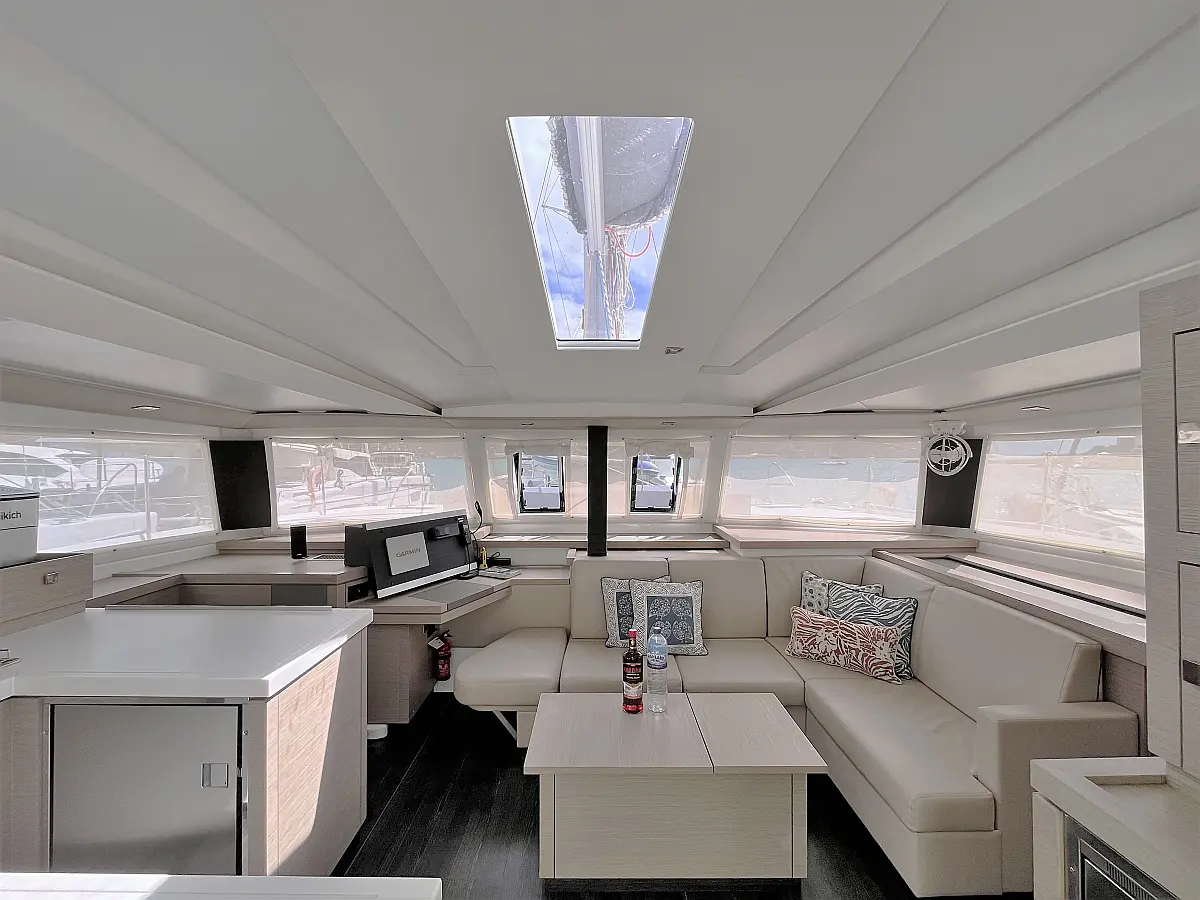 Cafetera, Nevera, Wi-Fi e Internet, Convertidor, Embarcación auxiliar, WC eléctrico, Aire acondicionado, Generador, Cockpit cushions, Panel Solar, Altavoces exteriores, Bímini