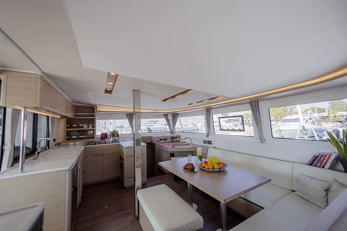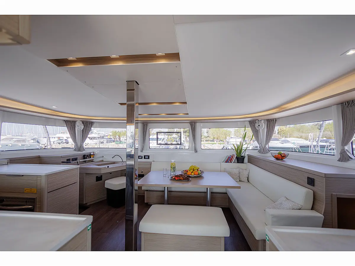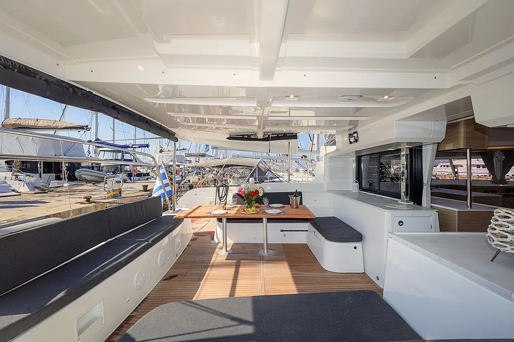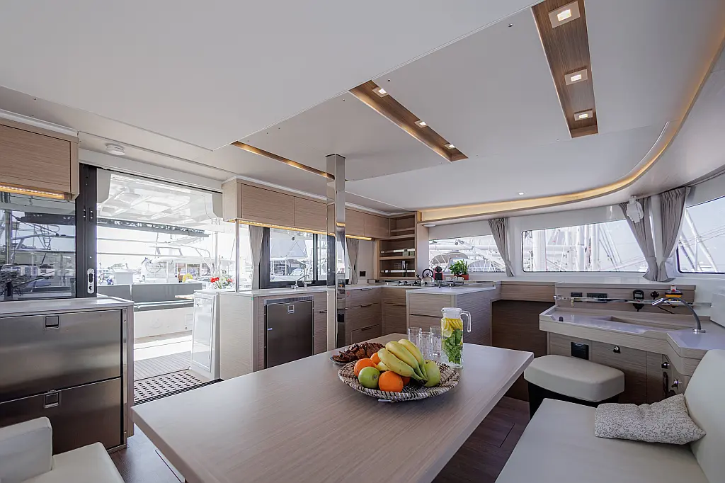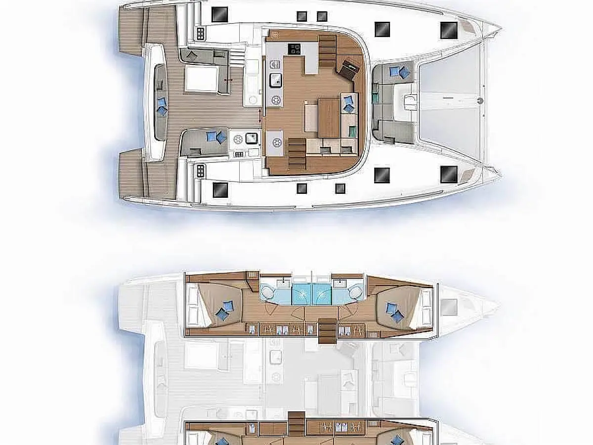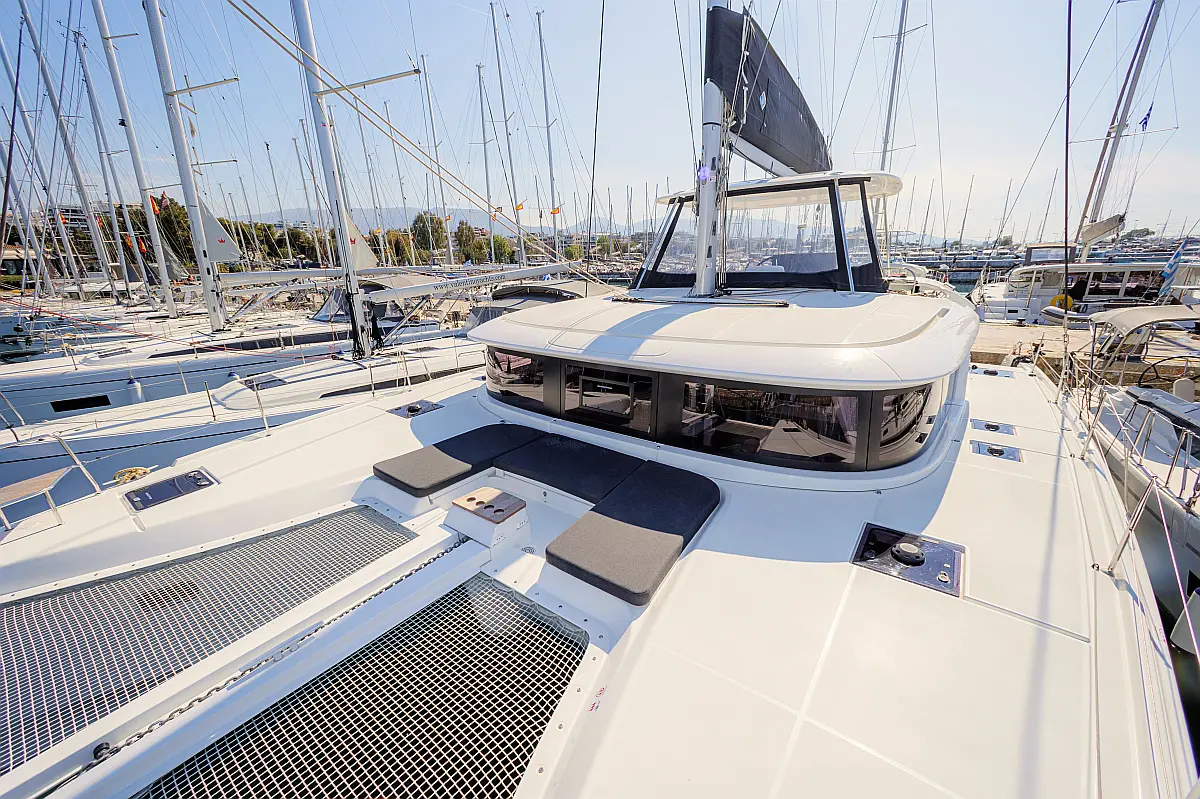 Nevera, Cafetera, Flybridge, Panel Solar, Generador, Calefacción, Aire acondicionado, Desalinizadora, Winches eléctricos, Bímini, Altavoces exteriores, Embarcación auxiliar