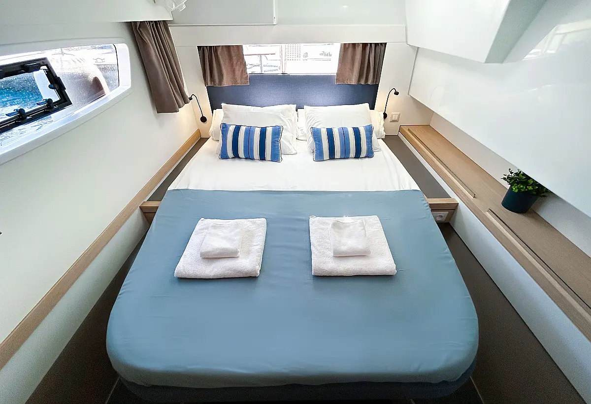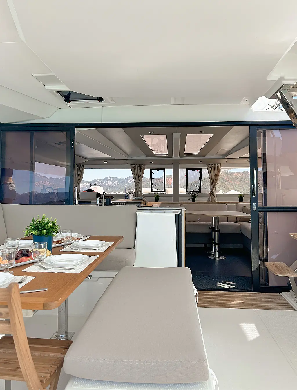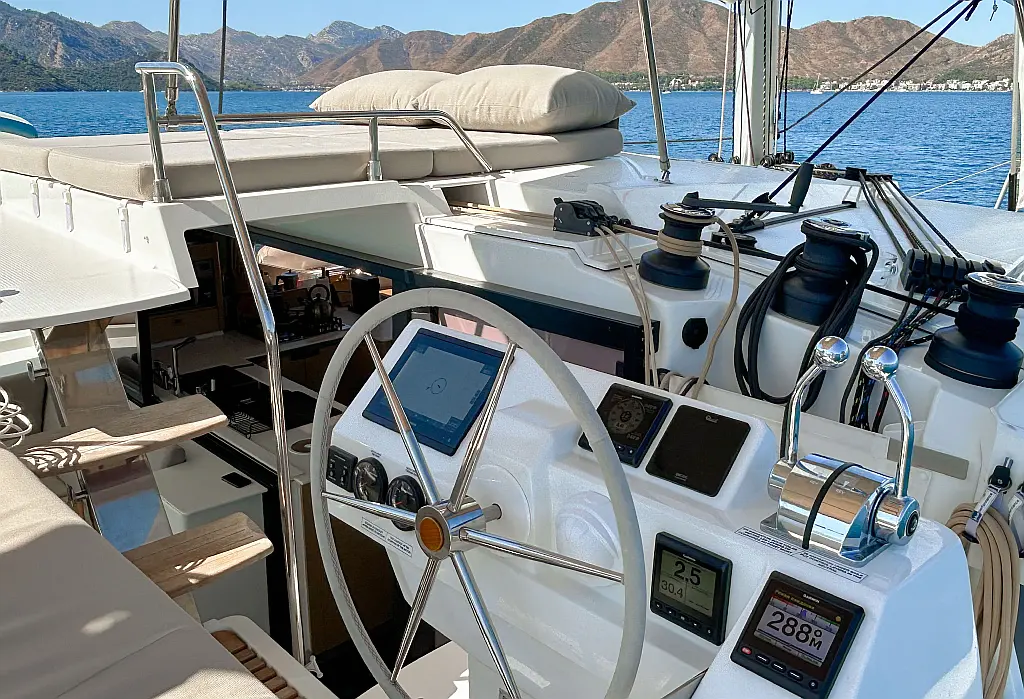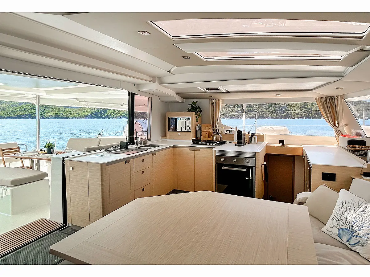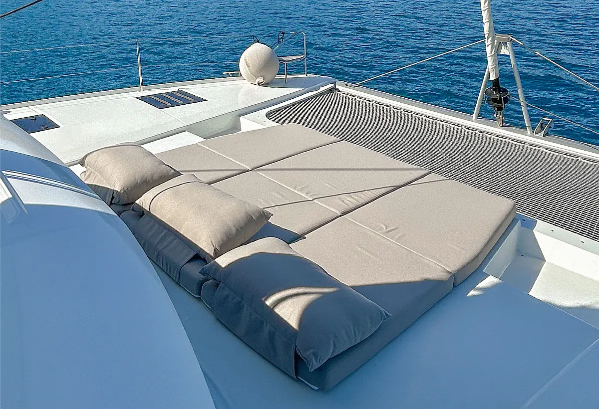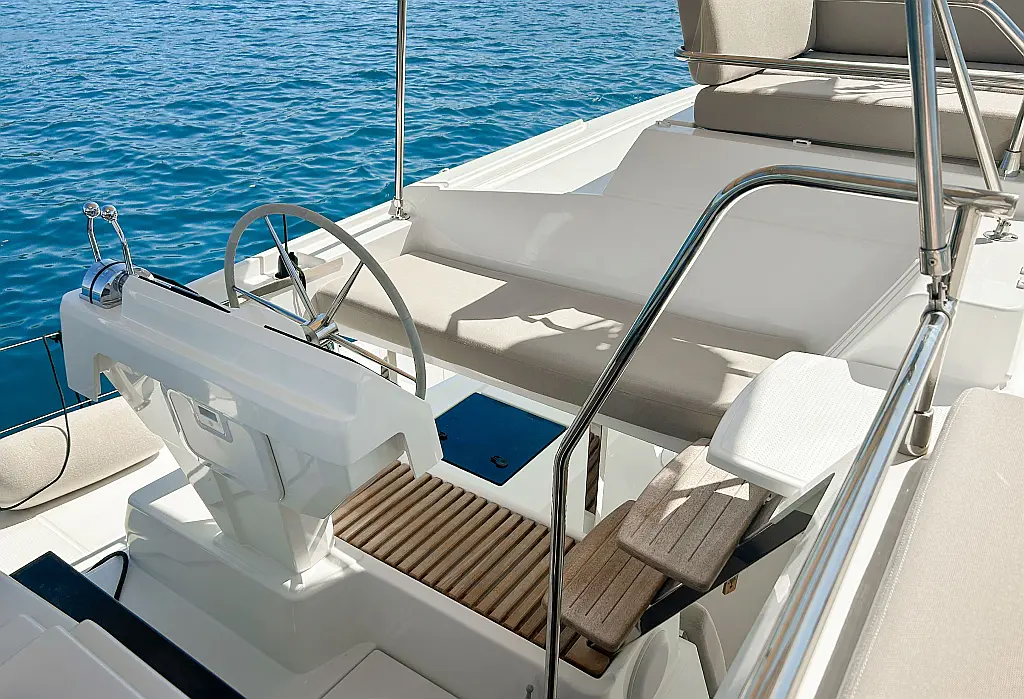Generador, Embarcación auxiliar, Cafetera, Convertidor, Aire acondicionado, Desalinizadora, Winches eléctricos, Nevera, Panel Solar, Cockpit cushions, Altavoces exteriores, Wi-Fi e Internet, WC eléctrico, Flybridge, Parrilla en carlinga, Bímini, Máquina de hielo, Motor fueraborda, Capota antirociones