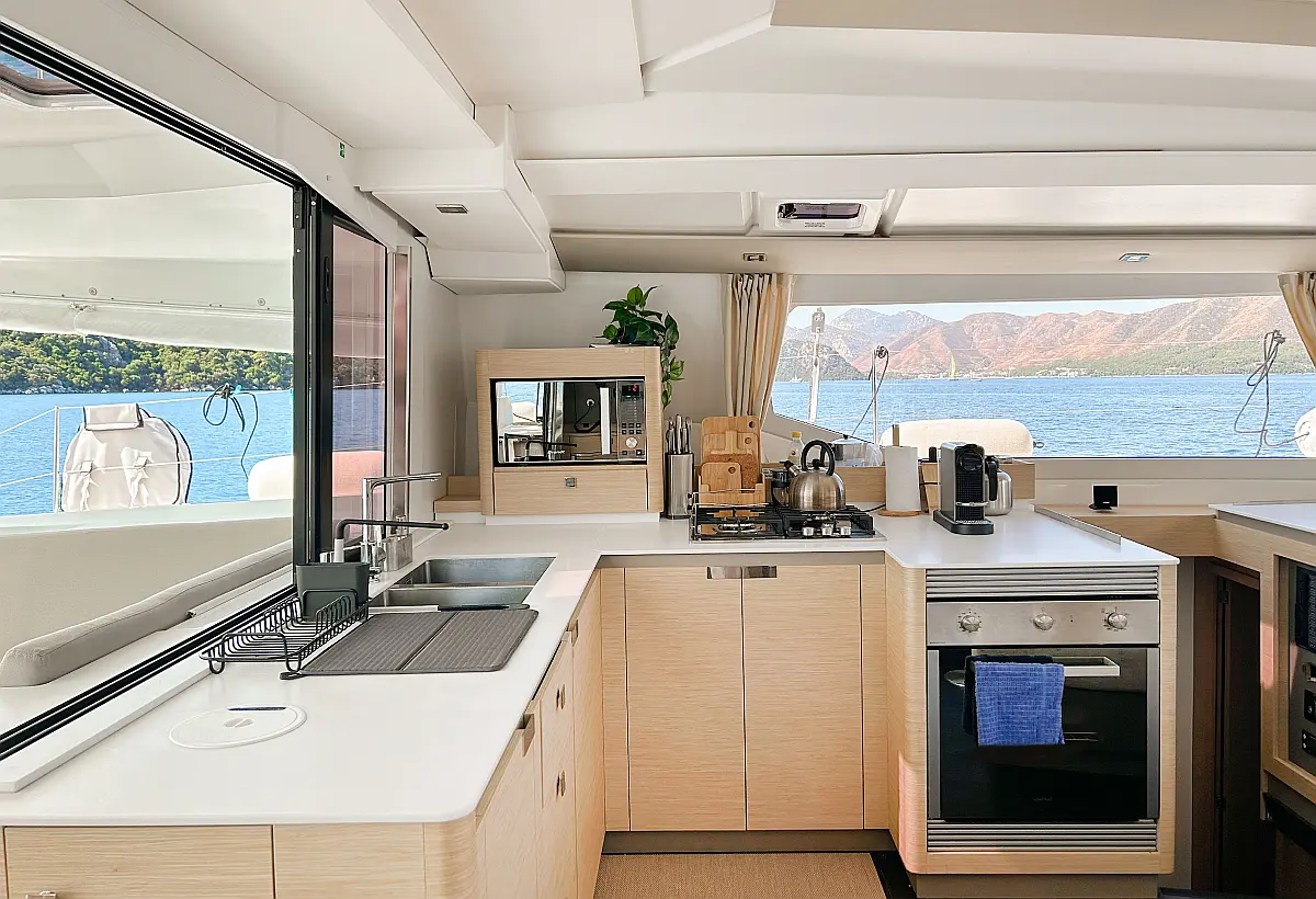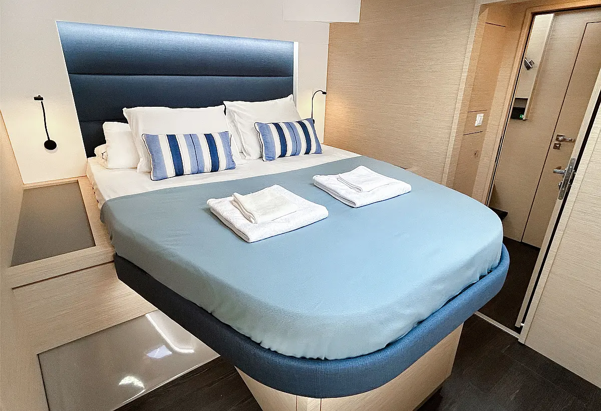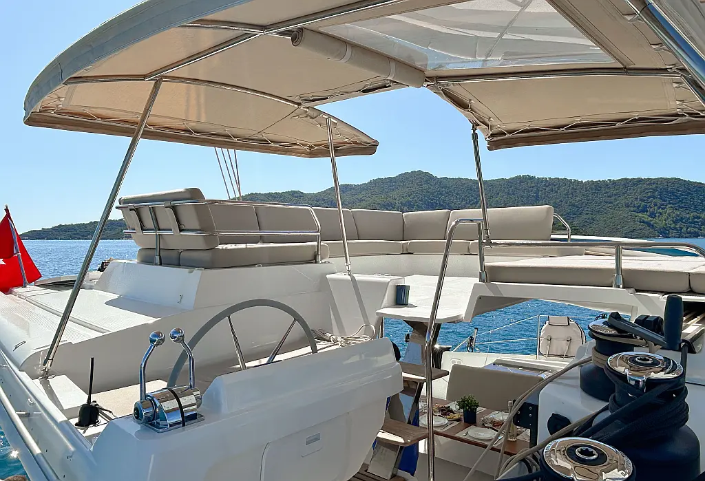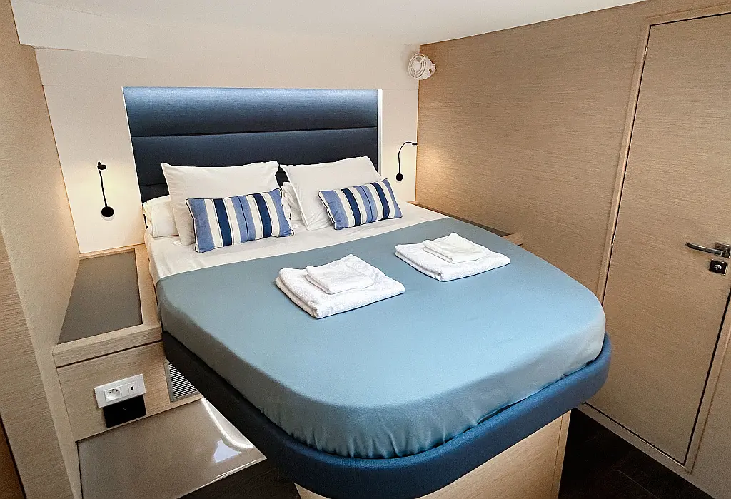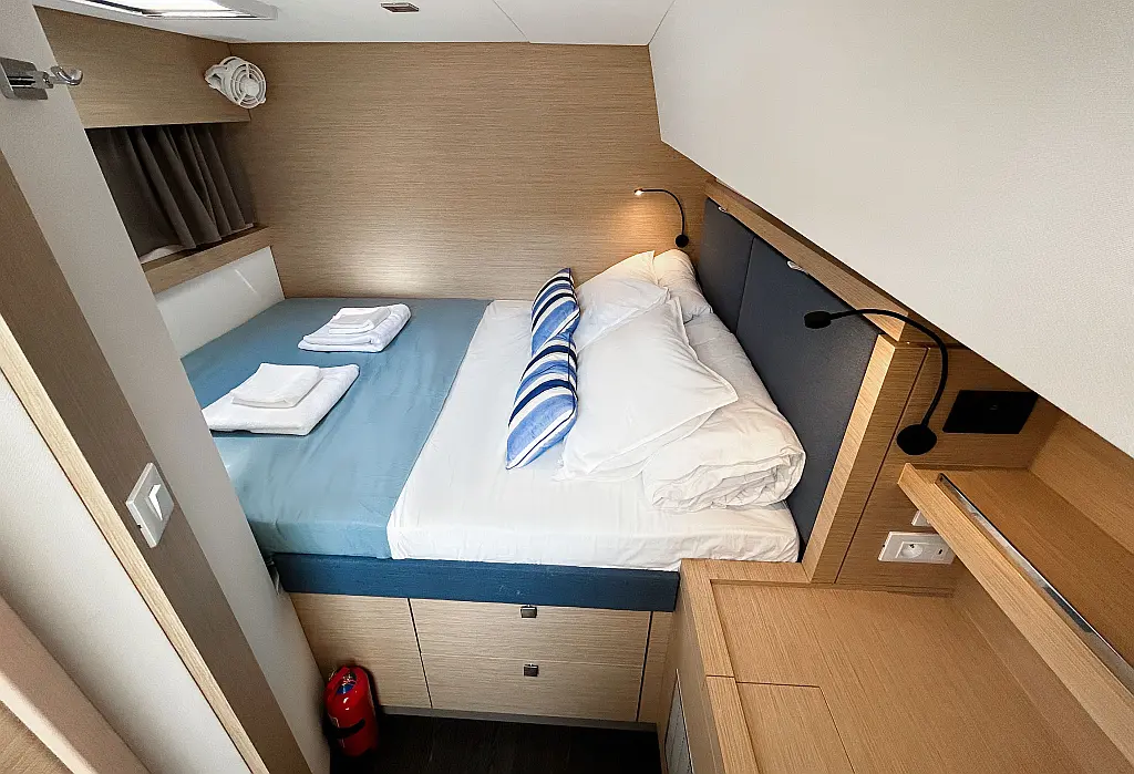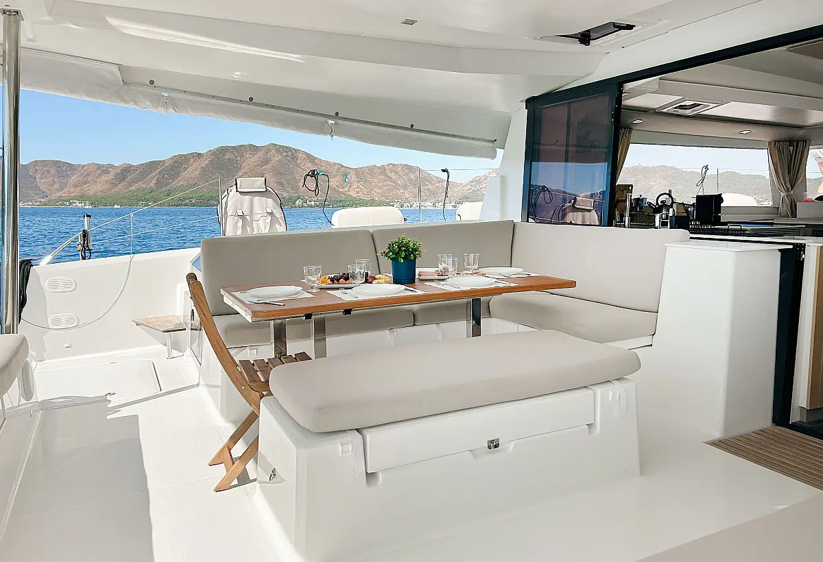 Generador, Embarcación auxiliar, Cafetera, Convertidor, Aire acondicionado, Desalinizadora, Winches eléctricos, Nevera, Panel Solar, Cockpit cushions, Altavoces exteriores, Wi-Fi e Internet, WC eléctrico, Flybridge, Parrilla en carlinga, Bímini, Máquina de hielo, Motor fueraborda, Capota antirociones